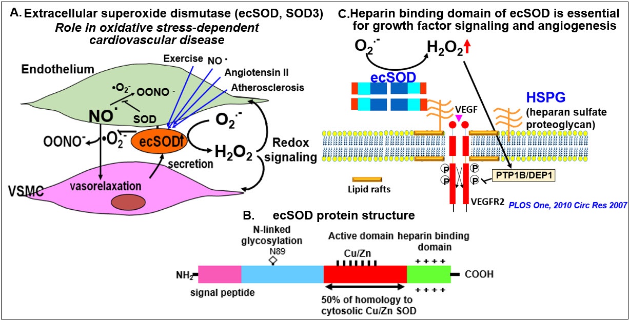 Extracellular SOD (ecSOD, SOD3) is a major extracellular antioxidant Cu-containing enzyme highly expressed in the vasculature and synthesized by vascular smooth muscle cells (VSMCs) and fibroblasts. It is secreted and anchored to the extracellular matrix and endothelial cell surface through the heparin-binding domain (HBD). Because of its extracellular location, ecSOD plays a major role in protecting against inactivation of nitric oxide (NO) by superoxide (O2•-), thereby preventing endothelial dysfunction in oxidative stress–dependent cardiovascular diseases. Furthermore, ecSOD catalyzes the dismutation of O2•-to H2O2that functions as a signaling molecule in the vasculature via HBD. Using ecSOD knockout mice, we demonstrated that ecSOD plays an important role in protecting against endothelial dysfunction in hypertensin and diabetes as well as promoting angiogenesis. Most recently, we demonstrated role of “exosomal” ecSOD in circulating plasma in exercise-induced angiogenic effects in endothelial cells in type 2 diabetes. Given these findings, we are studying role of ecSOD in vascular pathophysiology.