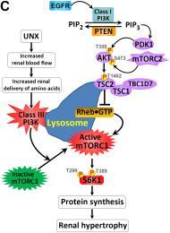 When you end up with only one kidney due to developmental problems or surgical renal ablation (secondary to diseased kidney, trauma, or donating a kidney), the nephrons in the remaining kidney will grow larger and consequently the lone kidney gets bigger. In fact, such compensatory renal hypertrophy occurs in virtually all kidney diseases that cause nephron damage and, consequently, a reduction in the number of functioning nephrons. Although the phenomenon of compensatory renal hypertrophy was first described more than a century ago, the underlying signals and mechanisms mediating the onset and extent of compensatory renal hypertrophy have long been a mystery. Our laboratory is interested in identifying the growth signals and molecular signaling mechanisms that regulate the initiation and the extent of compensatory renal hypertrophy. Our initial study revealed that unilateral nephrectomy (UNX) induces compensatory renal hypertrophy of the remaining kidney by activating the mechanistic (originally mammalian) target of rapamycin (mTOR), as documented byour publication inJ Am Soc Nephrol.2005 May;16(5):1384-91. Our follow-up study indicated that homozygous deletion of S6 kinase 1 (S6K1) inhibits renal growth induced by UNX or diabetes (Am J Physiol Renal Physiol.2009 Sep;297:F585-93). Our further study revealed that phosphorylated ribosomal protein S6 (rpS6) is a major downstream effector of the mTOR complex 1(mTORC1)-S6K1 signaling pathway mediating UNX-induced kidney growth (Kidney Int.2015 Mar;87:543-56). Our continued and focused research in this area has recently led us to identify increased amino acids (delivered into the remaining kidney by increased renal blood flow in response to removal of contralateral kidney) as molecular growth signals that initiate activation of the mTORC1-S6K1 signaling pathway to mediate compensatory renal growth; we have also demonstrated that the signaling pathways of different classes of phosphatidylinositol 3-kinase (PI3K) converge on the activation of mTORC1-S6K1 signaling to regulate kidney size in a context-dependent manner (Figure 1). Thus, our studies have found an answer at the molecular level to explain the century-old question: why does the remaining kidney grow larger when one kidney is lost? For more details, please see the original publication inJ Clin Invest.2015 Jun 1;125(6):2429-44 and the related CommentaryJ Clin Invest.2015 Jun 1;125:2267-70. Our more recent study revealed striking kidney growth in mice with proximal tubular cell-specific knockout of the tuberous sclerosis 1 gene (Tsc1), which encodes the protein TSC1 (also known as hamartin) as a negative regulator of mTORC1 (Figure 2A). The goal of our continued research endeavor in this area is to identify therapeutic targets to protect nephrons from further injury in order to prevent the development of end-stage renal disease (ESRD), preclude the loss of kidney function, and avoid the painful and costly kidney dialysis and transplantation.